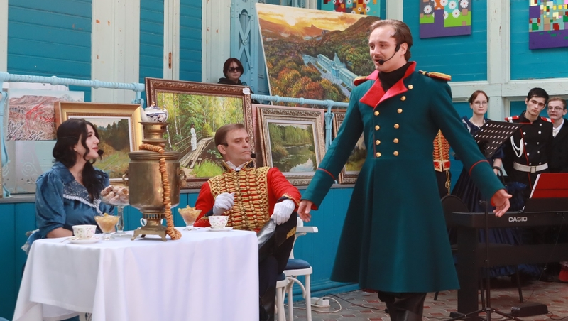 В малом зале Пушкинской галереи установили звуковое оборудование и декорации — стол с самоваром, чайными приборами, баранками и вареньем. А также стулья для нескольких десятков зрителей — помещение не вместило всех желающих, вход был свободный. Пришедшие стали свидетелями живого общения между Лермонтовым и его близкими, узнали интересные факты о его жизни и творчестве, а также окунулись в атмосферу XIX века. Выступление Анны Водопетовой в образе популярной певицы — современницы поэта стало сюрпризом для публики, так как о нём не заявляли в программе. Под аккомпанемент синтезатора артистка исполнила романсы «Белеет парус одинокий…», «Мне грустно, потому что…» и другие.