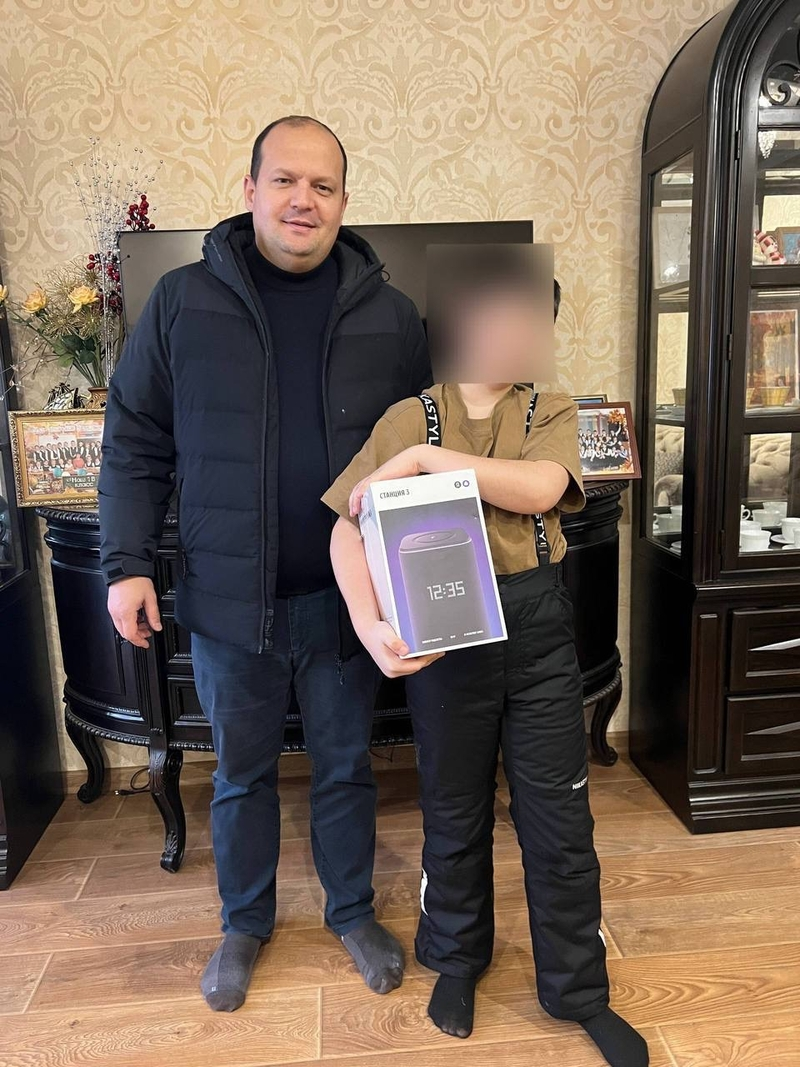 Подарок глава города вручил участнику акции по имени Платон. Мальчик загадал «подарок-сюрприз». Организаторы выяснили, что ребёнок мечтал об умной колонке.